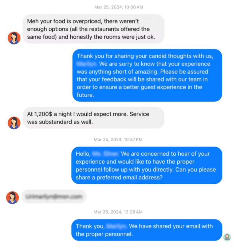 See how our monitoring team responded to an honest guest about their experience at The Ritz-Carlton Half Moon Bay.