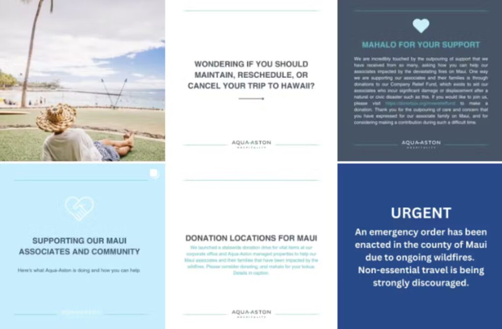 An example of a recent natural disaster was the devastating fires in Maui. With our guidance, our partner Aqua-Aston Hospitality responded to the situation on social media with the utmost care for informative communication, given many of their properties, guests, and staff were impacted by the fires. In collaboration with the property teams, we deliver timely & relevant messaging while maintaining empathy during this traumatic time. The protocol outlined above ensured a thoughtful plan to release relevant, sensitive, and current information in a rapidly evolving situation. On behalf of Aqua Aston, SoHo continues to monitor their messaging as the communities around the property are rebuilt.