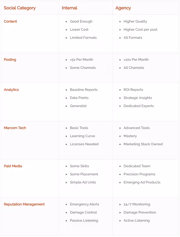 Running social media programs that include organic and paid media is an ongoing investment. The staff hours required to run a program vs the outside costs of an agency can be ball-parked. Just look at your volume for the entire program. Then decide if there is enough for an in-house staffer–or if it is enough for an in-house staffer to manage an agency resource.